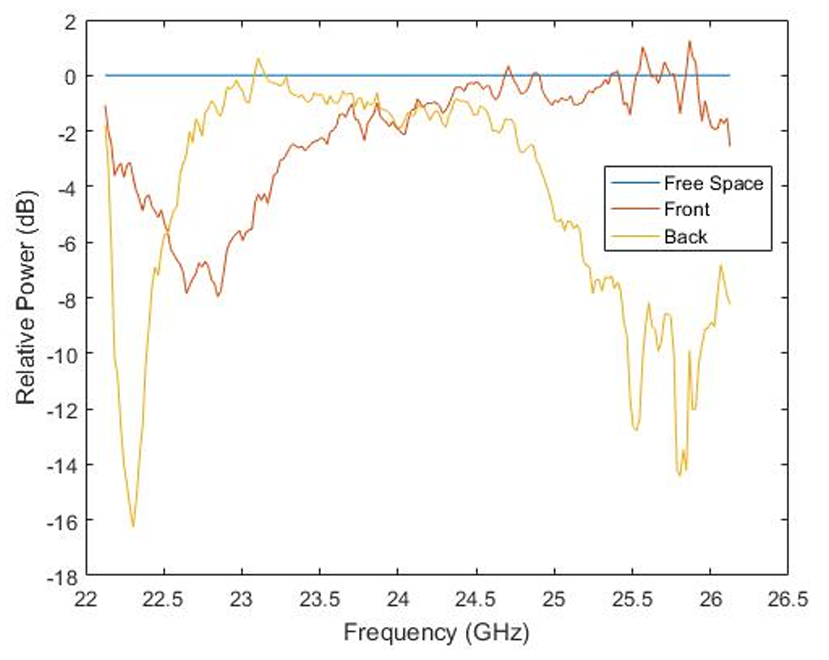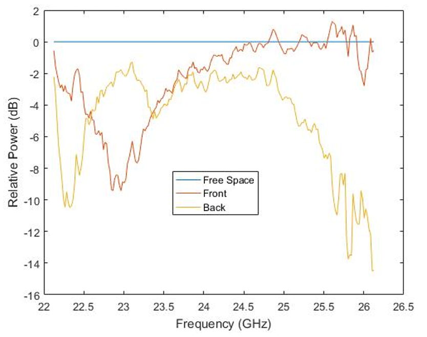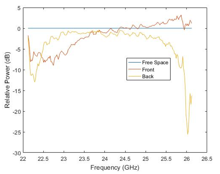 As seen above the results in orange of the metalens show a region of operation between 25.5 GHz and 26 GHz with a gain of about 2.5 dB. This is with the lens in normal operation. When reversed, the lens disperses the wave with a center frequency of 25.25 GHz.